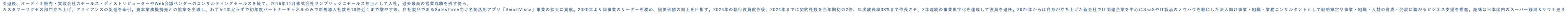 引退後、オーディオ販売・買取会社のセールス・ディストリビューターやWeb会議ベンダーのコンサルティングセールスを経て、2016年11月にSalesforce(SFA/CRM/MA)のSIer/プロダクトカンパニーのセールス担当として入社。自社プロダクト事業において過去最高の営業成績を残す傍ら、カスタマーサクセス部門の新規立ち上げや代理店との協業促進を牽引。資本業務提携先との協業を主導し、わずか1年足らずで初年度パートナーチャネルのみで新規導入社数を10倍近くまで増やす等、自社プロダクト事業の拡大に貢献。2020年より同事業のリーダーを務め、提供価値の向上を目指す。2023年の執行役員就任後、2024年までに契約社数を当年期初の2倍、年次成長率38%まで伸長させ、2年連続の事業黒字化を達成して役員を退任。